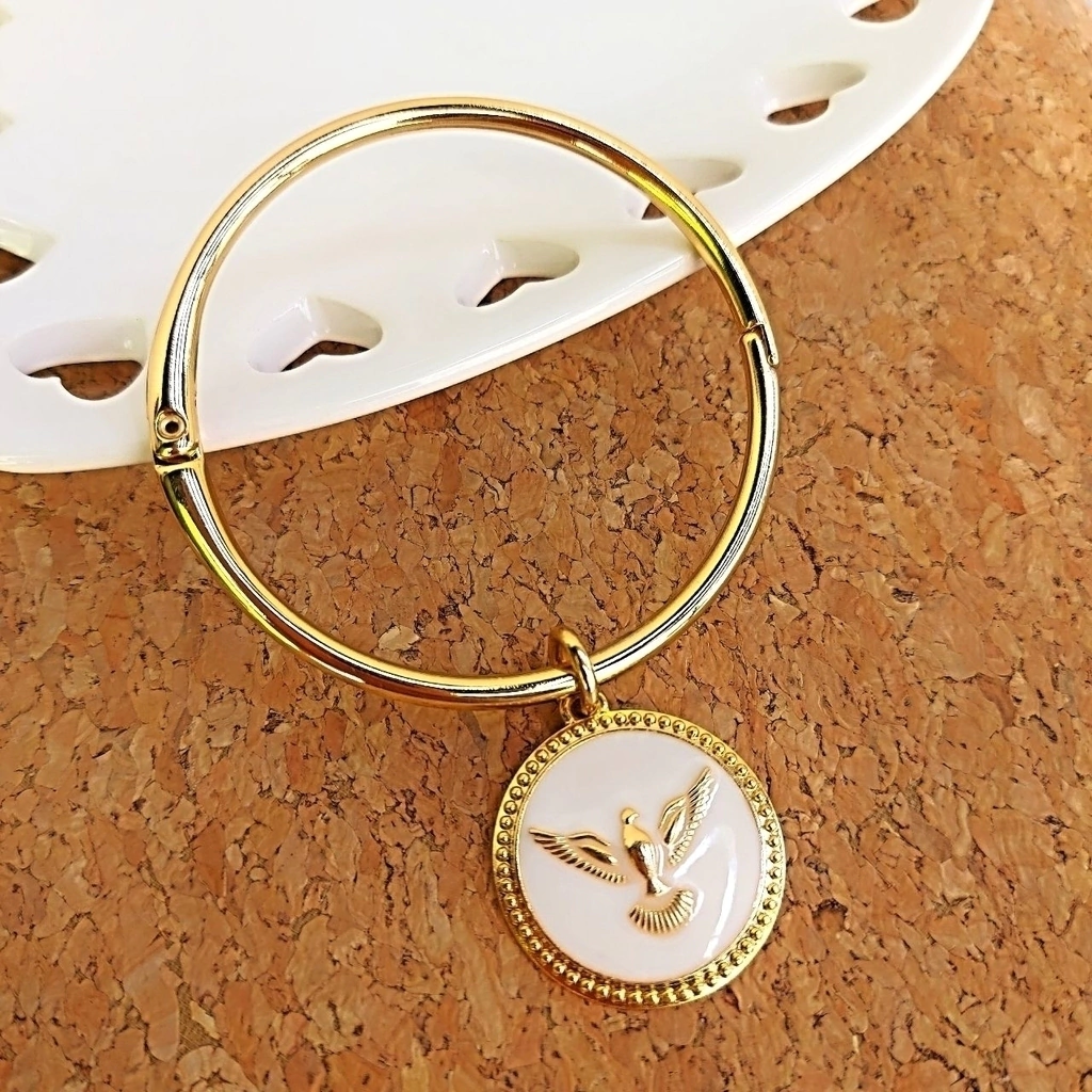O Bracelete Espírito Santo é uma peça de joalheria inspiradora, que combina fé e moda de maneira sublime. Banhado a ouro 18k, este bracelete está disponível em tamanhos de aro de 18 e 20 cm, tornando-o perfeito para diferentes tamanhos de pulso. No centro, um pingente delicadamente trabalhado com a imagem do Espírito Santo mede 3 x 3 cm, servindo como um lembrete constante de fé, esperança e proteção. O fechamento de pressão assegura que o bracelete seja tanto prático quanto elegante, fácil de colocar e seguro no pulso. Ideal para quem deseja expressar sua espiritualidade com estilo, o Bracelete Espírito Santo é um acessório significativo que transcende o simples adorno.